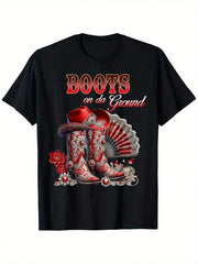 Boots On The Ground Western Cowboy Boot Graphic T-Shirt for Men - Black with Red & White Floral Print,